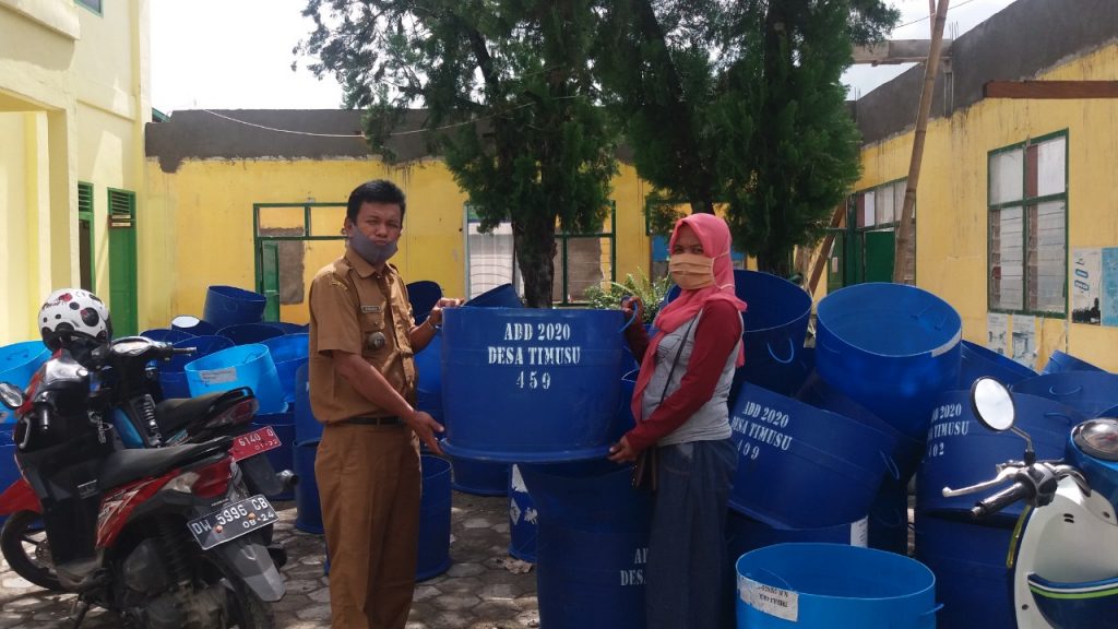 Kades Timusu, Firdaus, menyerahkan 450 bak sampah kepada Pengurus Bank Sampah di desanya, Senin, 13 Juli 2020.